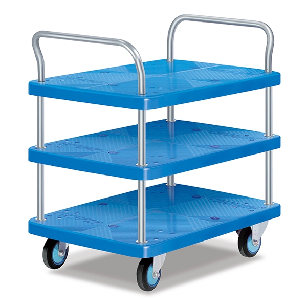 三層(céng)雙扶手(shǒu)全靜手(shǒu)推車由塑料車板、粉末(mò)噴(pēn)塗扶(fú)手(可折倒、固定)、行走輕便及(jí)超安靜(jìng)腳輪(尼龍(lóng)支架、鐵板支架)等組成。